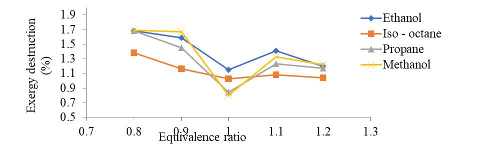ExergyDestructioninpercentageisshownin Figure 7. OnchangingtheEquivalentrationavailabilityofeachofthechosen fuel’schangesfromtimetotime,Itdecreasesuptoequivalentratio1afterthatitincreases.