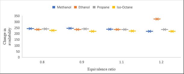 Figure9illustrateshowtheequivalencyratiochangesinrelationtoavailabilityduringcombustion.Ithasbeendemonstrated thatforpropanefuels,availabilitychangesastheequivalencyratiorises.However,theavailabilityofiso-octaneandethanol changesinawavypatternduringthisprocess,whichisbecausetheairfuelratioandcombustionefficiencyplayaroleinthe availabilitychanges.Theairfuelratioandcombustionefficiencybothdropwhentheequivalencyratiorises.Itisadditionally demonstratedthatunderleanconditions(Φ=0.8and0.9),availabilitychangeswhentheequivalencyratiosforpropane, methanol,andethanolgrow.