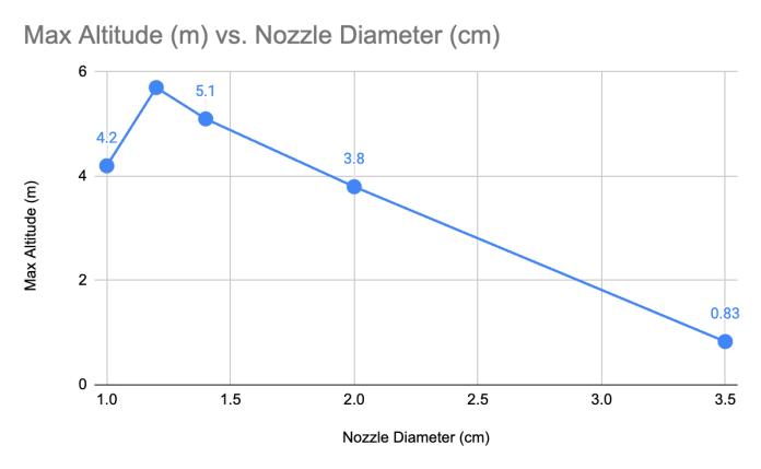 Abstract - This study investigates the effect of nozzle diameter on the maximum altitude achieved by water rockets constructed from 750ml soda bottles. While theoretical models provide limited insights due to complex multiphase flow dynamics, experimental validation remains essential for optimization. Using computational predictions from NASA Glenn Research Center's water rocket simulator followed by systematic experimental testing, we evaluated nozzle diameters ranging from 1.0cm to 3.5cm in 2mm increments. All rockets were pressurized to 135 psi with a 1/5 water fill ratio. High-speed video analysis at 60 fps enabled precise trajectory tracking and kinematic calculations. Results demonstrated that a 1.2cm nozzle diameter achieved a maximum altitude of 5.7m, while the largest 3.5cm nozzle yielded only 0.83m. Frame-by-frame analysis using pixel-to-meter conversion with the bottle as reference provided position, velocity, acceleration, and jerk profiles. These findings validate theoretical predictions of optimal nozzle diameters between 9-15mm and demonstrate the critical importance of balancing thrust magnitudewithburndurationforaltitudeoptimization.