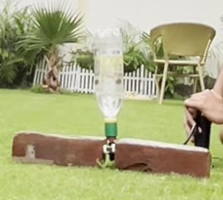 with 3D-printed nozzle caps. Nozzle diameters were varied from 1.0cm to 3.5cm (bottle mouth diameter) in 2mm increments, creating 14 distinct test configurations. Each bottle was filled to precisely 2/3 capacity (500ml) with water and pressurized to 135 psi (930 kPa) using a calibratedfootpumpwithintegratedpressuregauge.