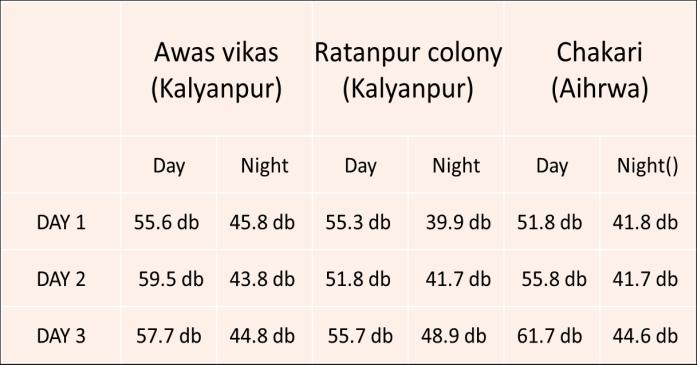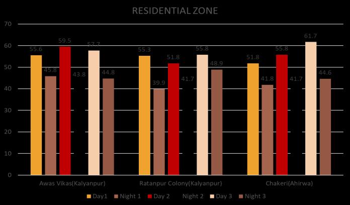 InresidentialzonetheaveragesoundlevelinAwas vikas(kalyanpur)57.6dbindayandinnight44.8db, inRatanpurcolony(kalyanpur)54.2dbindayand in night 43.5db, in Chakari 56.4db in day and in night42.1db.