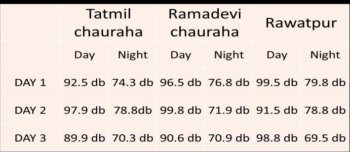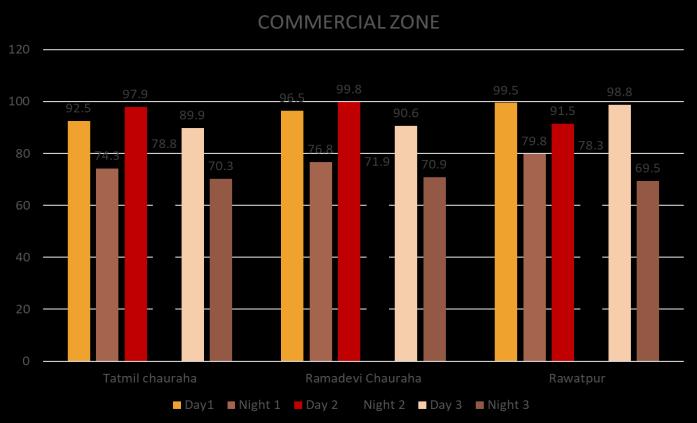 In commercial zone the average sound level in Tatmilchauraha93.3dbindayandinnight74.4db, in Ramadevi chauraha 95.6 in day and in night 73.6db, in rawatpur 96.6db in day and in night 76db.