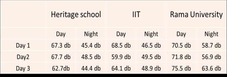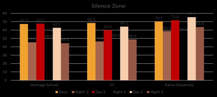 In silent zone the average sound level in heritage school 65.9db in day and in night 46.1db, in IIT 64.1db in day and in night 48.3db, in Rama university72.6dbindayandinnight61.5db.