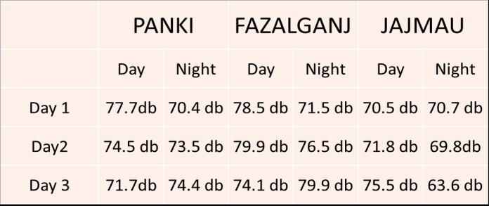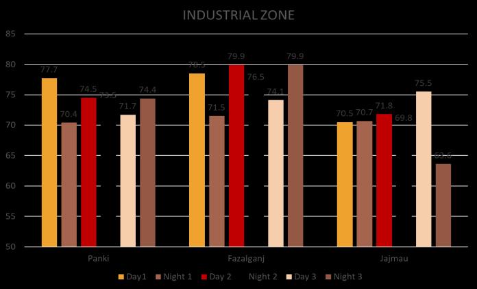 InindustrialzonetheaveragesoundlevelinPanki 74.6db in day and in night 72.7db, in fazalganj 77.5db in day and in night 74.8db, in jajamau 72.6dbindayandinnight68db.