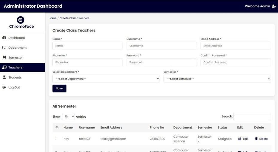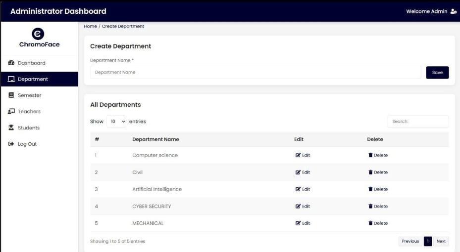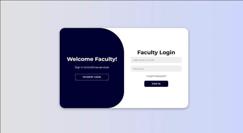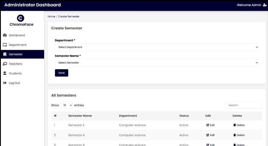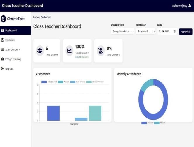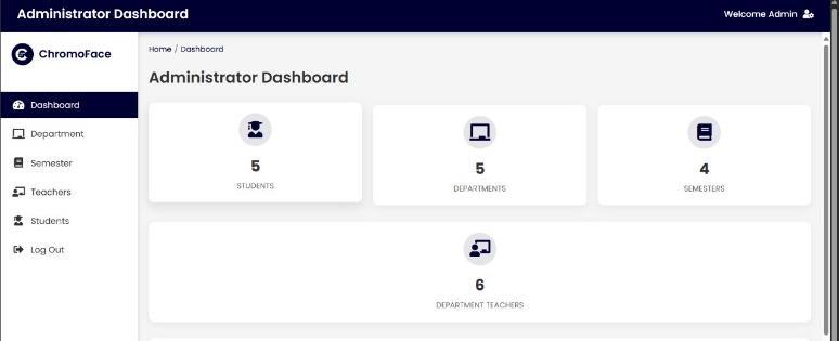 The project features three distinct user interfaces tailored to different roles. The admin dashboard facilitates departmentandsemestermanagement,usermanagement, system configuration, and attendance reporting. The faculty dashboard allows real-time attendance monitoring, department-wiseandsemester-wisefilters,andattendance statistics reporting. The student dashboard displays personalattendancerecords,providesacalendarview,and presentsattendancestatisticsforindividualstudents.