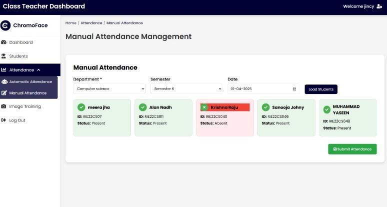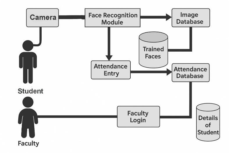 Faculty members can access the system through a dedicated login interface, which connects them to student details stored in the system. This enables real-time monitoring and management of attendance records. The system architecture integrates components like image storage, face recognition logic, and database interaction, delivering a contactless, automated attendance solution that enhances classroom efficiency and reduces manual effort.