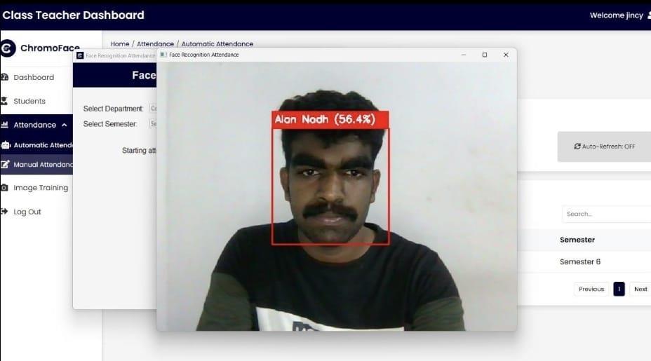 The project employs a camera to automate student attendance through facial recognition technology. When a student appears before the camera, their facial image is captured in real time and passed to the face recognition module.Usingpre-trainedfacialdata,thesystemcompares the captured image against stored entries in the image database. If a match is found, the system logs the attendanceentryintotheattendancedatabase.Themodule leverages trained facial data to ensure accurate and efficientidentification.
