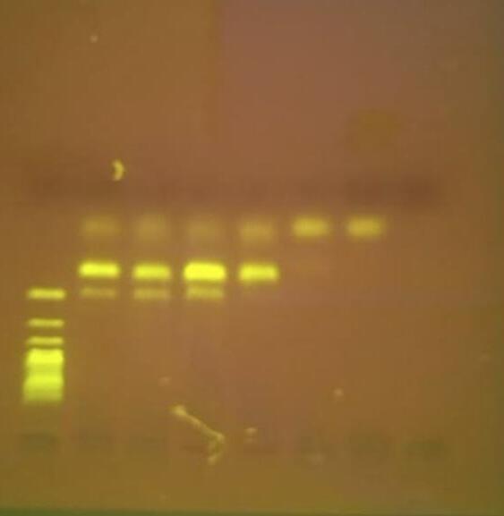 Figure 2 (Left) Is the electrophoresis get for specimens59through64.Theelectrophoresisgel,on the left, shows the 100 bp ladder then DNA from specimens59through64,inorder.TheinsectDNAis located furthest from the wells at 709 bp, and the Wolbachia DNA is located below the insect DNA at 438 bp. Specimens 59 through 62 are infected with Wolbachia. Another bacterium’s DNA is visible just below the Wolbachia DNA in specimens 59 through 61. Beings we targeted the 16S rDNA gene in bacterium and there are variations in the sequence with different bacterium, the primer we used picked an unidentified bacterium in specimens 59, 60 and 61. The university laboratory did not have the equipment or reagents necessary to identify the bacterium.