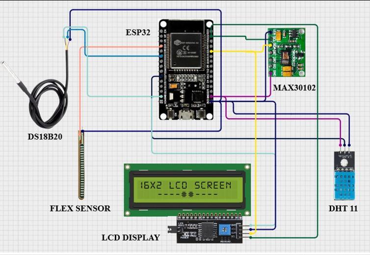 All sensors are interfaced with the ESP 32, which processes signals and sends data to the Thing Speak cloud via Wi-Fi. Real-timereadingsarealsodisplayedlocallyontheLCDforclinicalreference.