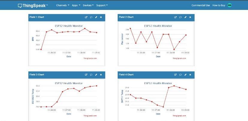 Thing Speak enables real-time visualization through dynamic graphs, providing caregivers and doctors with historical trendsandinstantupdatesfromanylocation.