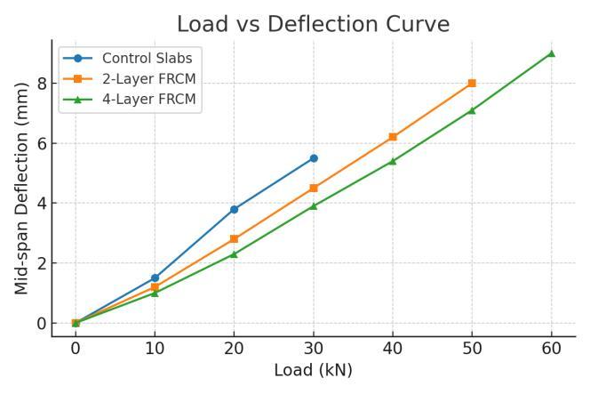 Thegraphshowsthatcontrolslabscarriedthelowestload andfailedearlywithlargerdeflections.Slabsstrengthened withtwolayersofFRCMresistedhigherloadsandshowed reduced deflections, while four-layer slabs carried the maximum load with further improvement in stiffness. Strengthened slabs also exhibited a more gradual failure, provingthatFRCMenhancesbothcapacityandductility