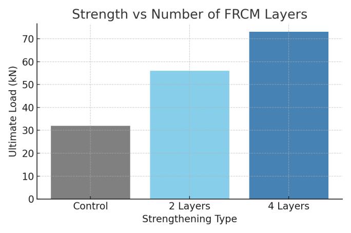 Thebarcharthighlightsthesteadyincreaseinultimateload withadditionalFRCMlayers.Comparedtothecontrolslabs, two-layerslabsshowedabout75%improvement,andfourlayer slabs achieved nearly 128% higher strength. This confirms that the number of strengthening layers directly influencesflexuralperformance.
