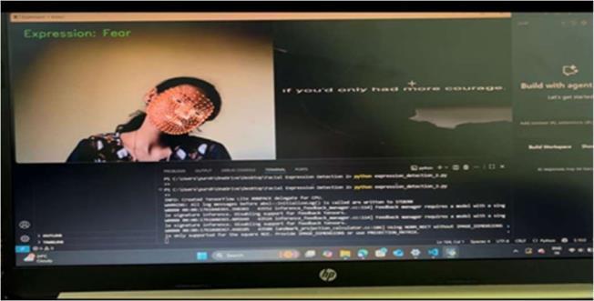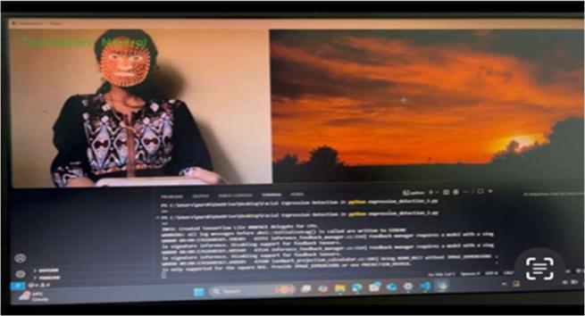 Fear expressions typically displayed raised eyebrows, stretched eyes, and a slightly opened mouth. The system detected this expression accurately when the features were prominent. However, borderline cases between “fear” and “surprise-like” reactions required stronger thresholdvaluestoavoidmisclassification.