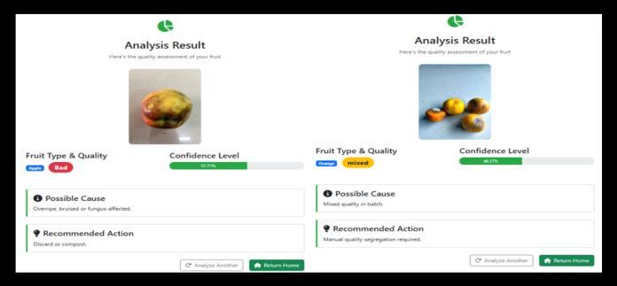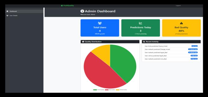 7)Integration with Flask:Thetrainedmodelwasintegrated intoaFlask-basedwebapplicationtoallowuserstoupload fruit images for real-time quality predictions. Predictions, along with probability scores, causes, and recommended treatments, are displayed on the results page. The system alsologsallpredictionsinadatabasefortracking,analytics, and dashboard visualization, facilitating practical deploymentinmarkets,warehouses,andprocessingunits.