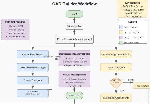 Ensuring design accuracy and consistency is another core objective. GAD Builder leverages scalable SVG components and a smart hashing system to maintain high-quality outputs while avoiding redundant work. Furthermore, it lays the foundation for collaborative design by supporting future features like real-time editing, version history, and secure access control, ultimately transforming the engineering design workflow into a more efficient, scalable, and userfriendlyprocess.