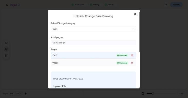 InGADBuilder,userscaneasilychangethebasedrawing of their project by selecting a new drawing from the component library or uploading their own. The tool provides intuitive options to replace, scale, and adjust elementstofitthenewbasedrawing, ensuringseamless integrationintotheproject.