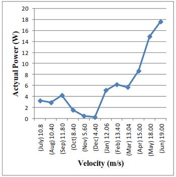 The graph between actual Power output versus Wind velocityshowsthatatzerovelocitythepoweroutputiszero. Fromthegraphbetweenactualpowerandwindspeedasthe speedincreasesthepowerdevelopmentbythehelixwind turbineisincreases.