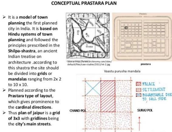 Jaipur, planned by architect Vidyadhar Bhattacharya in the 18th century, exemplifies Vastu Shastra in urban planning. Key architectural features include a grid layout with streets running east-west and north-south. The city is zoned for various activities residential, commercial, and religious following Vastu principles. Additionally, water bodies and gardens are integratedtoenhancethenaturalenvironmentandprovidecoolingeffects.