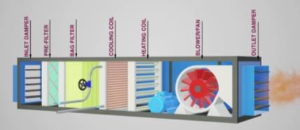 AHU- Anairhandlingunitisadevicethatcomprisesheating and cooling coils, fans, air control dampers, and filters. It begins by pulling in exterior air and mixing it with recirculatedairfromwithinthestructure.Thismixedairis then either heated or cooled before being transported throughoutthestructureviaaductsystem[8].