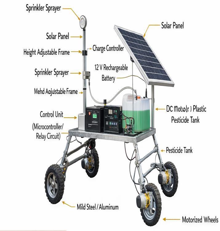 Animportantfeatureofthesystemistheheight-adjustable sprayerunit,whichallowsthenozzlepositiontobemodified accordingtocropheightandgrowthstage.Thisadaptability improvessprayingeffectivenessfordifferentcrops.Overall, thecoordinatedoperationofthesolarpowersystem,control unit, mobility mechanism, and spraying system enables efficient, safe, and eco-friendly pesticide application in agriculturalfields.