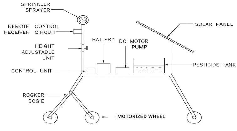 Mechanical Components: The chassis is fabricated from mildsteeloraluminumtoprovidesufficientstrengthwhile keeping the structure lightweight. Motorized wheels are usedalongwitharocker–bogiemechanismtoensurestable movementonunevenfarmland.Aheight-adjustablevertical frameisprovidedtosupportthesprinklersprayer,allowing easyadjustmentbasedoncropheight.Apesticidetankmade of chemical-resistant plastic is mounted securely on the chassistostorethepesticidesolution.
