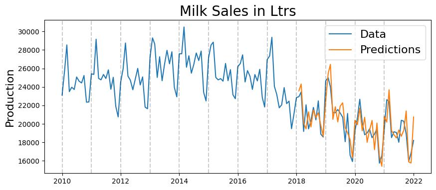Actual Data: The blue line represents the actual historicalmilksales,showingthefluctuationsand trendsovertheobservedperiod.