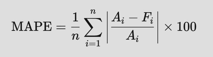 MAPE is calculated by taking the average of the absolute percentageerrorsbetweenthepredictedandactualvalues, andthenmultiplyingby100toexpressitasapercentage.It canberepresentedbythefollowingformula: