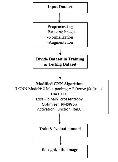 The proposed CNN architecture consists of three convolutionallayersforfeatureextraction,eachfollowedbya max-pooling layer to reduce spatial dimensions while retainingimportantfeatures.Aftertheconvolutionalblocks, twofullyconnecteddenselayerswereadded,wherethefinal dense layer used a Softmax activation function to perform binary classification. The model was compiled with the RMSprop optimizer, with a learning rate of 0.001, and the binarycross-entropyfunctionwasusedasthelossfunction. The training process was conducted for 30 epochs with a batch size of 10. Accuracy was considered as the primary evaluationmetric.