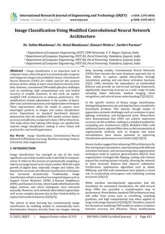 Abstract - Image classification is an important task in computer vision,where thegoalistoautomaticallyrecognize and categorize images into predefined classes. Convolutional Neural Networks (CNNs) are widely used for this purpose because of their ability to learn visual features directly from data.However,conventionalCNNmodelsoftenfacechallenges such as overfitting, high computational cost, and limited accuracy in complex situations. In this work, we explore modified CNN architectures to enhance performance. The modifications include adjustments in the number of layers, filtersizes,activationfunctions,andregularizationtechniques. These improvements allow the model to capture more meaningful patterns in images and reduce classification errors. Experiments on standard benchmark datasets demonstrate that the modified CNN models achieve higher accuracyandefficiencycomparedtobasicCNNarchitectures.