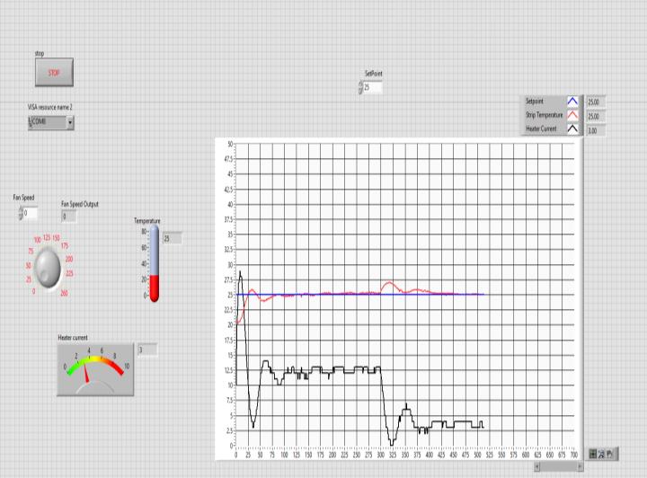 This is the testing with hardware as we can see we have setpoint 25 with fan speed 0 our controller is very nicely followingthetrajectorythatmeansitistrackingthesetpoint. the heater current is our manipulating or we can say controller effort . It will show more effort whenever our temperaturewillnotfollowthesetpoint.