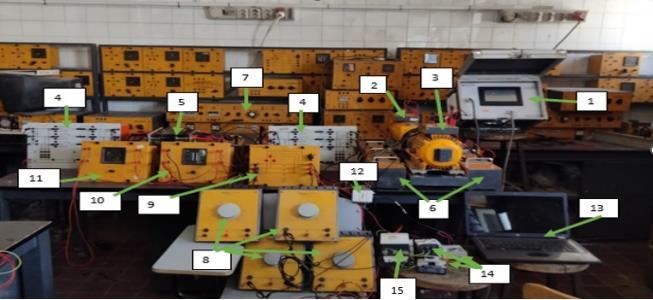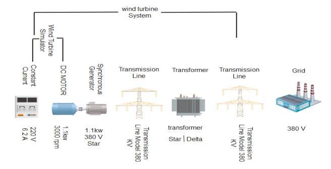 The laboratory system used in this study consists of two aspects,thefirstaspectrepresentsthewindpowersystem and consists of a simulator of a constant-speed wind turbine (a DC motor fed from a constant voltage and constant current source), a wound rotor induction generatorthatismechanicallyconnectedwithaDCmotor, and the excitation terminals of the generator are connected to a controlled DC source, an output of generator is connected to a transmission line, the second endofthetransmissionlineisconnectedtoatransformer, and the second end of the transformer is connected to a second transmission line. The second transmission line is at its end on one side of a circuit breaker responsible for connecting the system to the electrical grid when the synchronizationconditionsaremet.Thesecondsideofthe laboratorysystemistheelectricalgrid,anditisconnected totheotherendofthesynchronizationswitch.TheNi6009 toolisusedtotransfersignalsfromthelaboratorysystem tothelaptopbyusing6currenttransformerstomakethe valuesoftheelectricalsignalsmatchtheNi6009.