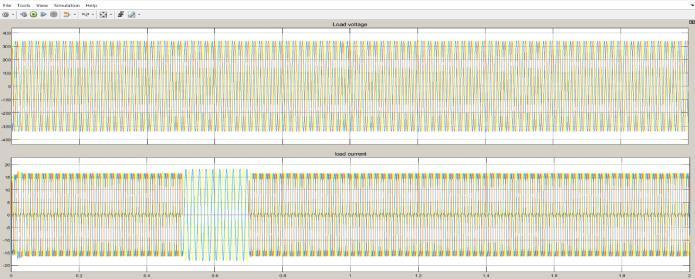 Analysis of Current Waveforms and Harmonic Mitigation: We evaluate the harmonic reduction performanceoftheshuntconverter.Bothbeforeandafter turningontheshuntconverter,thesimulationcalculatesthe total harmonic distortion of the current. The result of the simulation.TheTHDlevelsdramaticallydecreasewhilethe shunt converter is in operation, demonstrating that the UPQC successfully reduces harmonics brought on by nonlinear loads. The filtered current waveform's sinusoidal shapeatteststothepowerqualityenhancement.