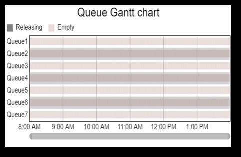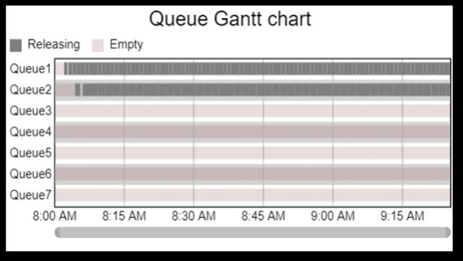 TheFigure3.5QueueGanttCharttracksqueuestatusfrom 8:00-9:15AMoversevenqueues.TheX-axisistimeandthe Y-axis contains queue names (Queue1–Queue7). Coloured barsdenotestatus:Gray(Releasing)andWhite(Empty).(J. Neira,etal.,2023)