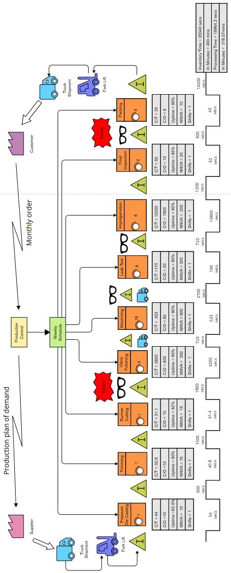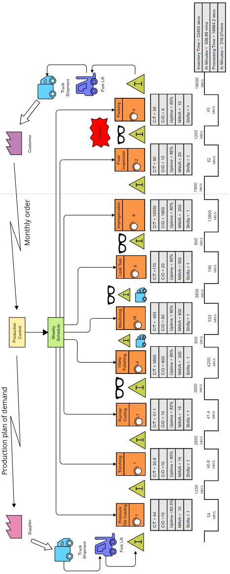 Value Stream Map (VSM) describes the process of production from supplier to consumer, including material flow, processing time, and inventory. The information is describedinthefigure5.1currentstatevaluestreammap. Raw materials received through truck shipments and are transportedusingforklifts.PressureDieCastinghasaCycle Time (C/T) of44s, Changeover Time (C/O) of10 min,and 82.5%uptime, followed byTrimming (C/T: 30.8s,C/O:10 min,80%uptime)andRunnerCutting(C/T:31.1s,C/O:10 min,82%uptime).VibroPolishingiscompletedin3600sper cycle, Machining in 453s, Leak Testing in 170s, and Impregnationin12,000s.FinalInspection(50s)andPacking (35s)finishtheprocess[8].Thetotal timeforinventoryis 33,400s (556.68 min), whereas the processing time is 18,864.2s(316.07min).AKaizenburstemphasizesareasfor improvement to eliminate bottlenecks and increase efficiency.M.C.May,2023)