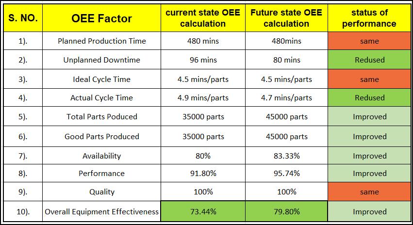 BasedonTable4.2CurrentandfuturestateOEEcomparison of ABC Production. The unplanned downtime falls to 80 minutes in the future state, cycle time to 4.7 minutes, and production to 45,000 units. The availability improves to 83.33%, performance to 95.74%, and OEE to 79.80%, increasingefficiencyandproductivity