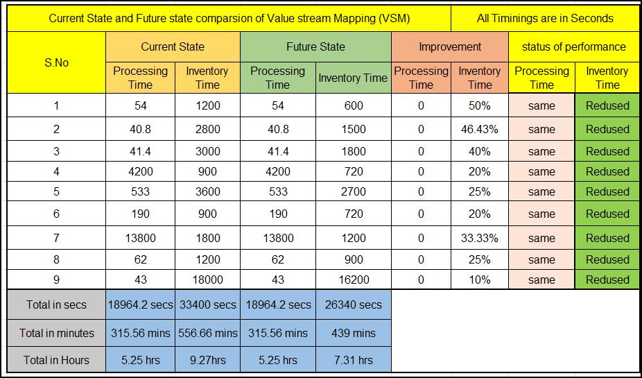 Bycomparing Table 4.1,VSM compares efficiency analysis indicating a 16.5% decrease in cycle time (13.99 to 12.58 hours)anda 21.07% decrease ininventorytime.Withthe sameprocessingtimeat5.27hours,efficientworkflow,less waiting time, and more effective inventory control reduce delays