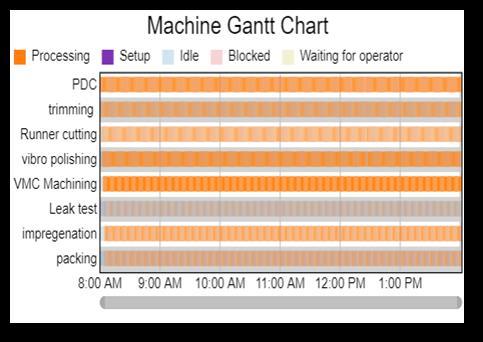 Figure3.4MachineGanttChartmonitorsschedulesbetween 8:00–9:45 AM. The X-axis shows time, and the Y-axis enumerates machines/processes (PDC, Trimming, Runner Cutting, Vibro Polishing, VMC Machining, Leak Test, Impregnation, Packing). Colored bars represent status: Orange(Processing),Purple(Setup),LightBlue(Idle),Pink (Blocked),andLightYellow(WaitingforOperator).