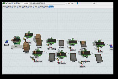 Changeover (C/O), and 82.5% uptime, with subsequent Trimming(C/T:30.8s,C/O:10min,80%uptime)andRunner Cutting (C/T: 31.1s, C/O: 10 min, 82% uptime) with optimizedmaterialflow.VibroPolishing(3600s),Machining (453s),LeakTesting(170s),andImpregnation(12,000s)are optimizedtoenhanceuptimeandminimizenon-value-added activities(NNVA).FinalInspection(50s)andPacking(35s) guarantee quality and readiness for shipment. Kaizen initiativesreducetotalinventorytimeto26,840s(493min) and processing time to 18,864.2s (316.07 min) while maintaining the same level of processing time, thus improvingoverallproductivityaswellasmeetingcustomer demandmoreeffectively.(A.Rastogi,etal.,2022)