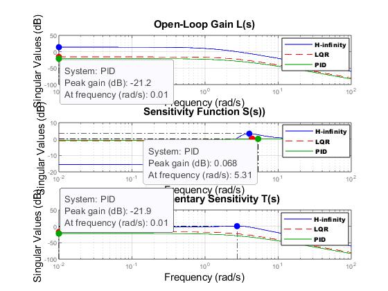 sigma(T_pid,'g',T_lqr,'b ',CL_hinf,'r-.',w); legend('PID','LQR','H-infinity'); title('SigmaPlot(SingularValue)Comparison'); gridon;