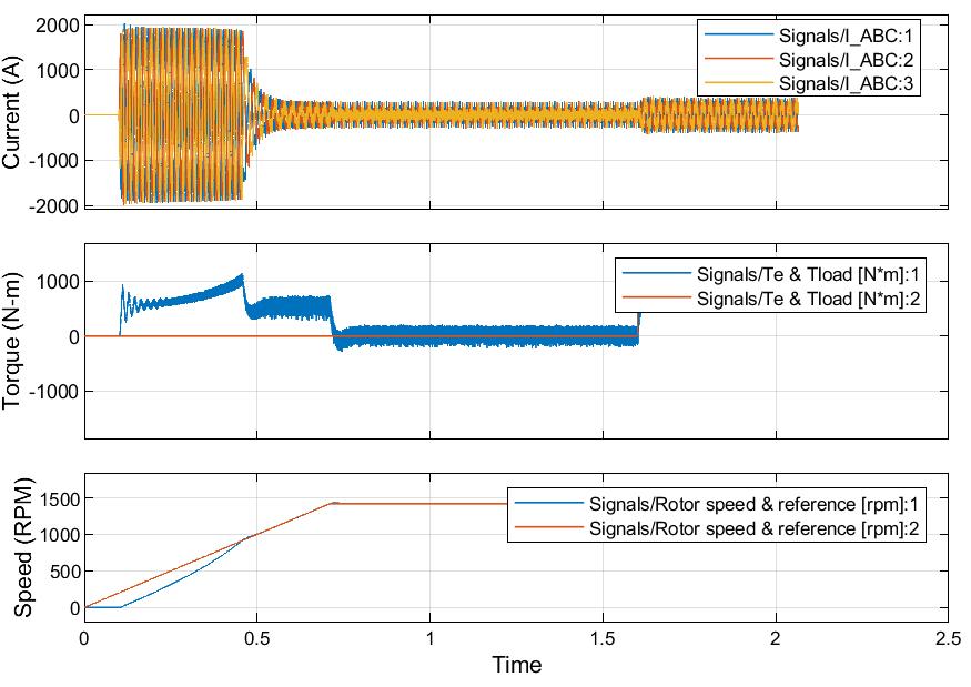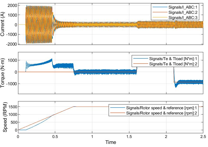 AnewMATLABscript(DSIM_Control_Comparison)wascreatedusingthecontrolsystemtoolboxtogeneratePIDandLQR functions. System parameters (Rs, Ld, Lq, km, J, B, P) were defined at the beginning. The state-space matrices (A, B, C, D) wereconstructedbasedonDSIMdynamicsandstoredasanss(state-space)object.Afterconstructingthestate-space,the controllers were manually selected (kp, ki, kd) for each loop and then combined into a diagonal matrix for feedback looping. The code was structured into clear sections (modeling, controllers, simulation, and plotting). The simulation was finally executed with a time vector t=0:0.01:1, speed of 1500 RPM, and step inputs depending on load conditions. System parametersarespecifiedinTable(3.1).TheMATLABcodesareshowninappendix1.