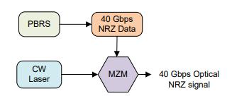 Fig.3.3showstheschematic block design forthe40Gbps NRZ transmitter. A 40 GHz NRZ data stream powers the MZMbyON/OFFkeyinganopticalsignalproducedbythe continuous-wave (CW) laser source. The applied electric