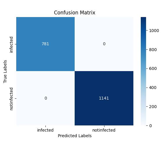 Confusion Matrix: The model achieved zero misclassifications,with781truepositivesand1141 true negatives, underscoring its reliability in distinguishing between infected and non-infected cases.