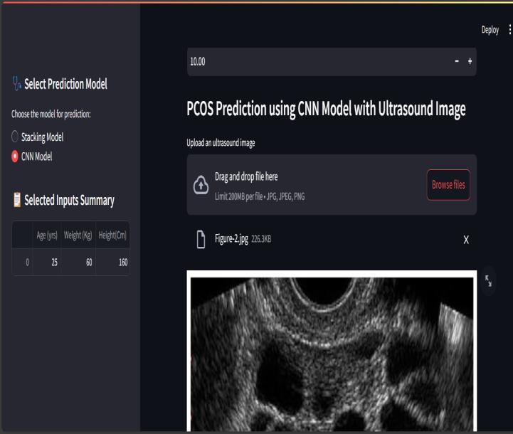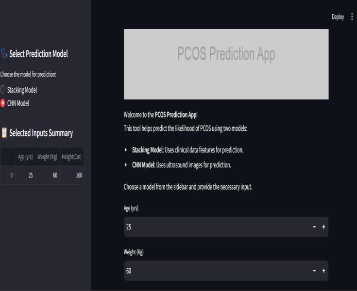 Thisstudysuccessfullydevelopedandvalidatedtworobust modelsforPCOSdetection,integratingmachinelearningand deep learning approaches. The stacking ensemble model achievedhighaccuracy(93%)andanAUCof0.99forclinical data, identifying critical predictors such as follicle counts, BMI, weight, and hormonal markers (LH, FSH, and TSH). Similarly,the CNN model achievedanaccuracyof92.72% and an AUC of 0.89 for ultrasound images, with zero misclassificationsandminimaloverfitting,demonstratingits reliabilityinimage-basedclassification.