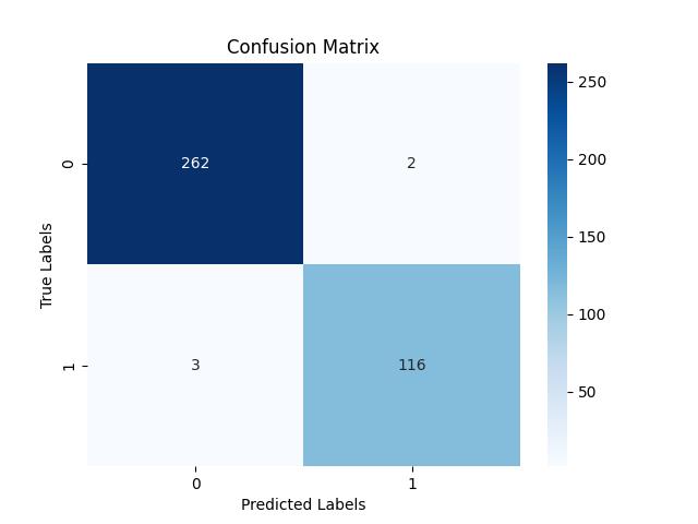 Theconfusionmatrixconfirmedthemodel'seffectiveness, withonly2falsepositivesand3falsenegatives,ensuringa strong balance between precisionand recall.Additionally, theROCcurveachievedanAUCof0.99,reflectingexcellent discriminative power across thresholds. The model's trainingutilized5-foldcross-validationonVSCodeIDEwith a fixed seed value of 42, ensuring consistent and reproducibleoutcomes.Theensembleapproach,combining ExtraTrees, AdaBoost, CatBoost, and gradient boosting models, effectively generalized across the clinical data, providingreliablediagnosticaccuracy.