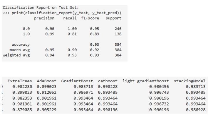 The stacking ensemble model demonstrated exceptional performanceontheclinicaldataset,achievinganaccuracyof 93%.Keyresultsinclude: