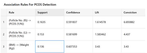 The association rules highlight significant predictors for PCOSdetection.Folliclecountintherightovary (support: 0.1635, confidence: 59.18%, lift: 1.61) and the left ovary (support: 0.153, confidence: 58.17%, lift: 1.58) are key diagnosticmarkers,emphasizingtheirimportanceinPCOS diagnosis.Additionally,thestrongassociationbetweenBMI andweight(support:0.136,confidence:60.73%,lift:3.43) underscorestheirroleinbodycompositionanomalieslinked to PCOS. These findings confirm the interconnection of hormonalimbalance,folliclecount,andbodycompositionin PCOS pathology. The high conviction values (e.g., 6.69 for Rule 1) and strong associations between follicle numbers, BMI,andweightunderlinetheinterconnectionofhormonal imbalanceandbodycompositioninPCOSpathology.