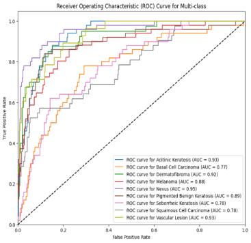 The model's high accuracy, sensitivity, and specificity demonstrate its effectiveness in accurately classifying Basel Cell Carcinoma, Cherry Nevus,Melanoma,andActinicKurtosis.