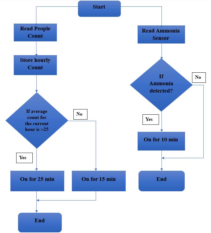 With the integration of motion sensors, ammonia gas sensors, and a real-time clock (RTC), the exhaust fan responds dynamically to current conditions inside the bathroom.Thefanactivatesimmediatelyupondetectinga personorhighammonia concentrationandoperatesfora presetdurationbasedontimerlogic.Thisreal-timeresponse