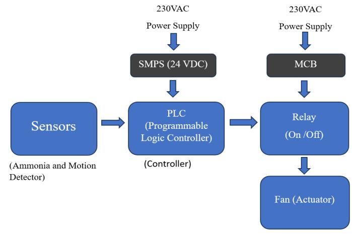 To operate in real-time, the system requires stable communicationbetweentheinputsensorsandthePLC,as wellasbetweenthePLCandtheoutputrelaycontrollingthe exhaustfan.Thesystem'spowersupplyismanagedthrough anMCBandaSwitchedModePowerSupply(SMPS),which convertsinputpowertoa 24VDCsupply suitableforPLC andsensoroperation.Therelaymoduleactsasaswitching device that enables or disables the exhaust fan based on commandsissuedbythePLC.