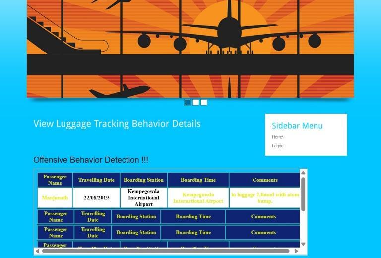 Thisoutputdisplaysluggagetrackinglinkedwithpassenger behavior.Itmonitorshowpassengershandletheirbaggage and flags suspicious patterns, helping identify potential securityrisks.